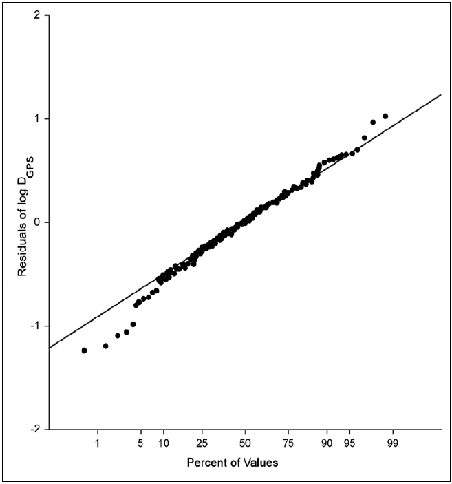 The residual analysis is performed to evaluate the empirical equation, obtained from the regression analysis. The residuals can be graphically analyzed in numerous ways. Pertain to that, we examined three types of the residuals; they are the histogram, the normal probability plot, the scatter plot of the residuals versus the sequence of the observations. The histogram of the residuals is to evaluate whether they are normally distributed. On the histogram, shown in Figure 4, we can visually evaluate the normality of residuals. For visually evaluating normality of the residuals, the better choice could be the normal probability plot (Figure 5), where the majority of data points are fallen along a straight line through the origin with a slope of 1.0. Some deviations from this straight line reflect departures from normality. Stragglers at either end of the normal probability plot indicate outliers, and the curvature at both ends of the plot indicates long or short distributional tails. In addition, a plot of the dependent variable (log DGPS) versus the first independent variable (Mw), and versus the second independent variable (Rhyp) could be useful to show outliers (Figure 6).