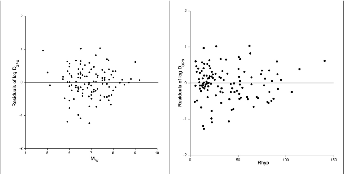 with the correlation coefficient (R2=0.66) and the root mean square of error (RMS=0.45) representing the uncertainty in (log DGPS). Thanks to the second independent variable, the relationship has been visibly improved. In the relationship (4), the (DGPS) unit is cm and (Rhyp) is hypocenter-to- GPS station distance in km.