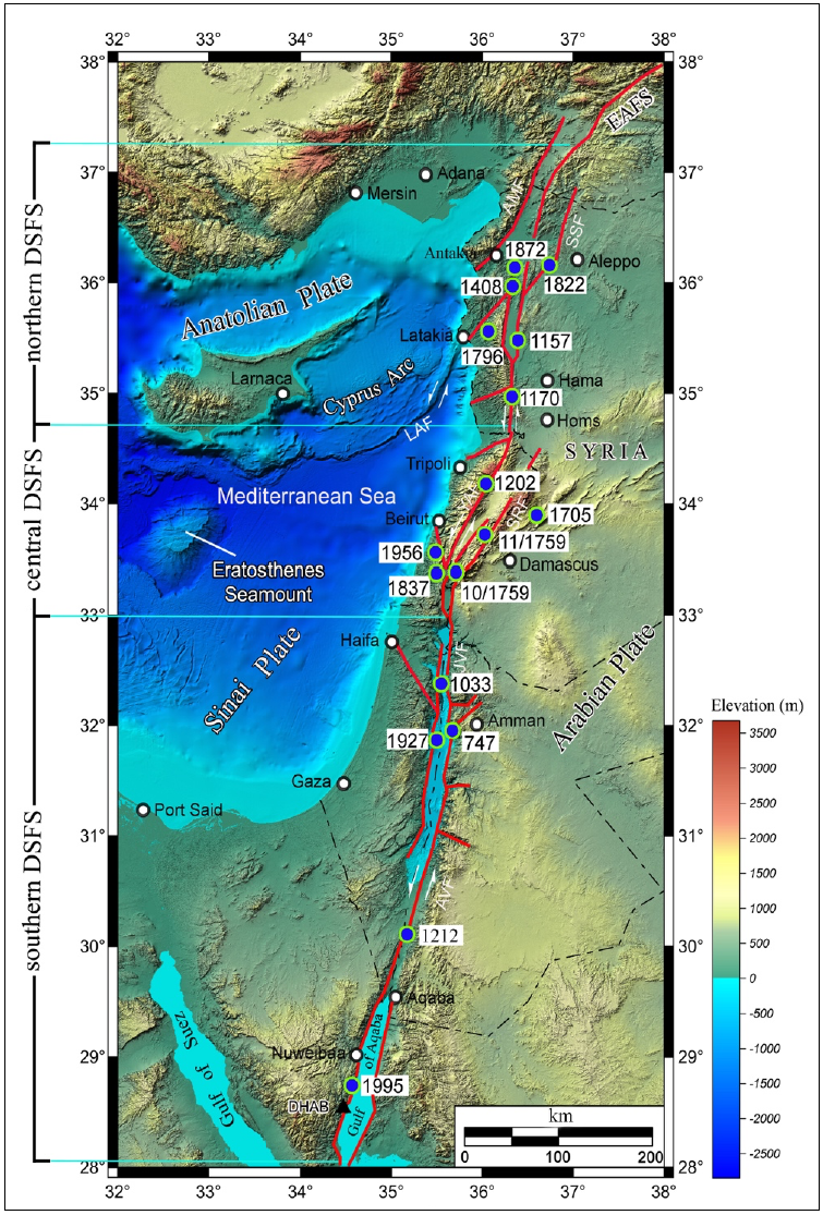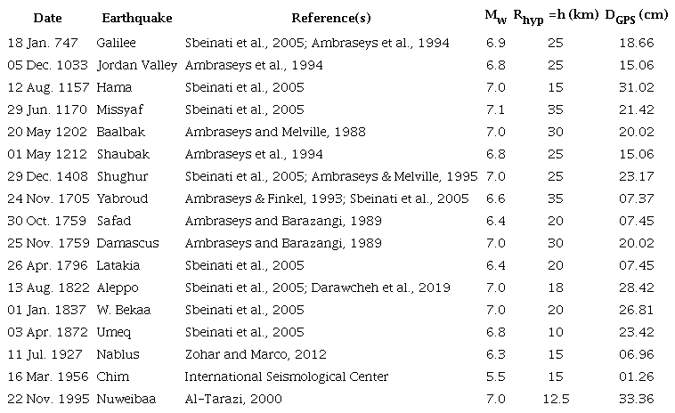 The last step in this research is the preliminary application of the obtained empirical relationship (4) for some large earthquakes occurred along the DSFS. The recent instrumental seismicity of Syria has produced a little number of low magnitude events (Abdul-Wahed & Al-Tahan, 2010; Abdul-Wahed et. al., 2011; Abdul-Wahed et al., 2018). Therefore, no GPS Seismology data are available in the region even along the DSFS. However, several large well-documented historical earthquakes occurred along the DSFS (Table 1 and Figure 7). In this case, the obtained empirical relationship (4) could be helpful to estimate the coseismic displacement causing the historical earthquake destruction in Syria. The DSFS is a regional active left-lateral strike-slip fault system that runs for about 1000 km long from the Gulf of Aqaba in the south to the East Anatolian fault system (EAFS) in the north near Antakia. It forms a transform boundary between the Sinai plate (part of the larger African Plate) to the west and the Arabian plate to the east. Both plates are moving in a general north-northeast direction, but the Arabian plate is moving faster, resulting in the observed left lateral motion. A set of large historical earthquakes along the DSFS is shown in Figure 7 and listed in Table 1 with depth according to the published literature. The related magnitude (Ms) has been converted to moment magnitude (Mw) using the empirical relation (1). The horizontal coseismic displacements have been estimated using the relationship (4) at the epicenter, where Δ=0. The results, shown in Table 1, demonstrate that the larger the earthquake magnitude, the bigger the GPS coseismic displacement. It could be useful to compare these empirical results with the real measurements of GPS stations. This comparison is enabled for an instrumental Nuweibaa earthquake, which occurred on 22 Nov. 1995 in Aqaba Gulf at the southernmost of the southern DSFS (Figure 7). The Dahab GPS station (DHAB) located at 26 km in the south-west of the epicenter, has documented a coseismic displacement of 17 cm (Kimata et al., 1997). The empirical results, shown Table 1, demonstrate the estimated coseismic displacement to be 33.36 cm at the epicenter of Nuweibaa earthquake. Taking into consideration the epicentral distance to the Dahab GPS station, the relationship (4) yields to 20 cm as coseismic displacement. The difference between the observed displacement and the estimated one is about 3 cm, where the relative error is about 15%. Therefore, the empirical relationship (4), obtained in the current research, could be fairly acceptable regarding the influence of numerous affecting factors.
