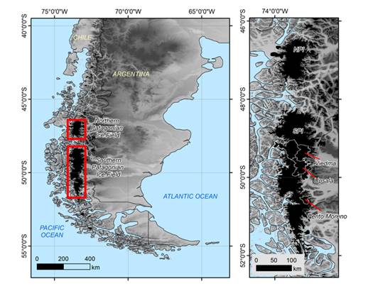 The main icefields in the Patagonian region are, on one hand, the Northern Patagonian Icefield (NPI), which is an ice mass that covers an area of 4,200 km2 (Figure 1) and is entirely located in Chile. The Arenales Hill and San Valentín Mount, both covered by glaciers, are important because of their height of 3,437 and 3,910 meters, respectively. On the other hand, the Southern Patagonian Icefield (SPI), which is a large continental ice region located on the border between Argentina and Chile and covers an area of 13,000 km2 (Figure 1). Numerous large glaciers arise from this, like the Montt, Pío XI (the largest of South America), Grey, Upsala, Viedma, and Perito Moreno. It is estimated that the SPI consists of 48 major glaciers and more than 100 minor glaciers.