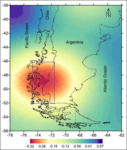In the Patagonian Icefield region, the gravity anomaly trend was negative for the entire area, with values ranging from -0.32 to -0.20 μGal/year. According to Figure 3, extreme values could be detected at the Southern Patagonian Icefield, in the proximity of the Viedma, Argentino and Rico lakes, delimited in Figure 2 from north to south, respectively.