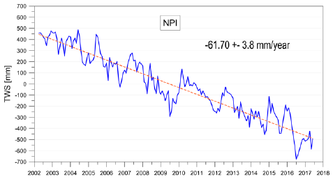 The results showed that the SPI region presents a more pronounced negative trend than the NPI region, which indicates a greater speed of the level melting of ice masses towards the south. Linear trends of total water storage were obtained for the north and south regions, resulting in values of -61.70 mm/year and -57.90 mm/year, respectively. Likewise, this negative trend was also demonstrated in the TWS maps, which showed the progressive total water storage decrease for the period 2002-2017.