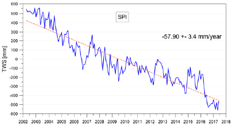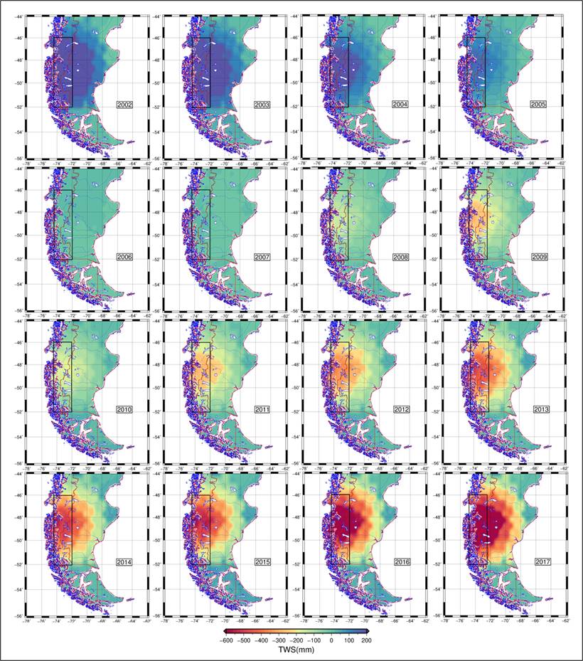 Figure 6 presents the mean annual TWS maps, where the progressive decreasing of the TWS in the NPI and SPI area from 2002 to 2017 can be observed.