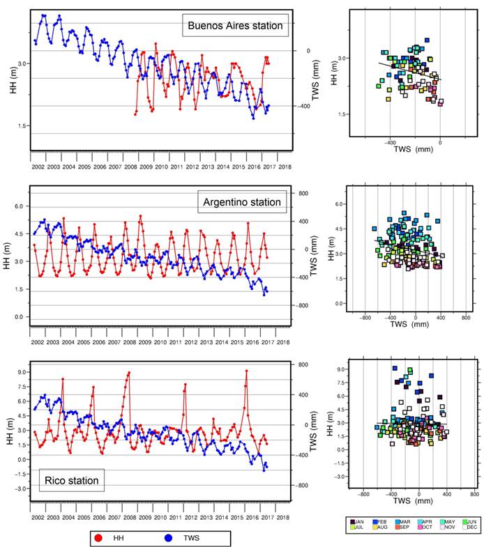 At this point, it is important to mention that the TWS data and the hydrometric heights represent different magnitudes. While GRACE "sees" the total water storage as a vertical column composed of surface water, groundwater and soil moisture integrated over a time period (monthly), the hydrometric height represents the water level reached in a section of a lake that can be measured on a daily basis.