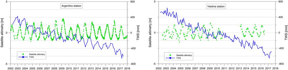 For the sake of analysis of the TWS results from GRACE in the glacier´s area, such results were compared with hydrometric heights series and satellite altimetry data of Patagonian lakes located in Argentina and Chile.