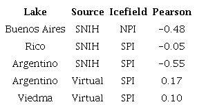 The resulting Pearson coefficients for the stations at the Patagonian lakes are shown in Table II. According to the results, the Argentino station (SNIH), located at SPI, presented the highest correlation value (over 50%). The remaining stations located in the south, both terrestrial and virtual, showed very low r coefficients; while the only one station at NPI -Buenos Aires- presented a Pearson correlation value close to 0.50.