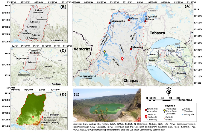 El área estudiada se encuentra dentro de la Región Hidrológica Grijalva-Usumacinta Núm. 30 (RH-30), la cual se ubica en la latitud norte 18° 0.106’ y 17° 18.122’ y longitud oeste 92° 52.205’ y 93° 34.427’. El río principal es el Río Grijalva, o Mezcalapa, como es conocido en esta porción de la cuenca Grijalva (Álvarez-Soberano & Medrano-Pérez, 2020). Administrativamente, se localiza en el sector norte del estado de Chiapas cubriendo pequeñas porciones de Tabasco en su parte norte (Figura 1a). Está delimitada por las subcuencas Río Viejo Mezcalapa, Río Mezcalapa, Río Tzimbac, Río Zayula, Río Platanar, Río Paredón, Río Pichucalco (Figura 1b). Posee una superficie de 381.97 km2, y alberga una población de 340,160 habitantes, según datos del año 2015 del Instituto Nacional de Estadística y Geografía (INEGI). Asimismo, el área de estudio cubre en su totalidad a la delimitación administrativa del acuífero Reforma, y parcialmente, a los acuíferos Samaria-Cunduacán, La Sierra, Huimanguillo, Ocozocoautla (Figura 1c).