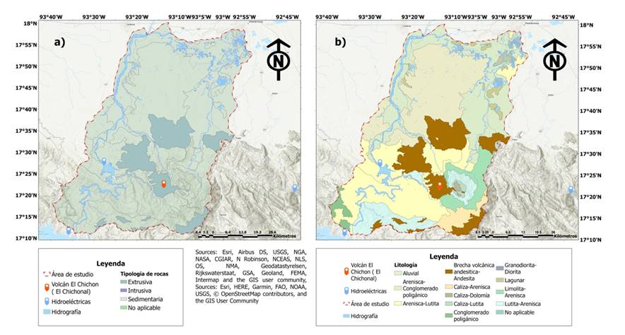 En tanto que la geología de la zona, al cubrir el acuífero Reforma prácticamente la totalidad del área estudiada, las características geológicas de este acuífero pueden ser representativas para el área estudiada. En la porción sur del área, correspondiente al límite norte de la Sierra de Chiapas, se encuentran aflorando rocas del Cretácico Inferior y Superior surcadas por una serie de fallas y plegamientos, así como sedimentos Terciarios y rocas ígneas extrusivas. Tienen amplia distribución las rocas calizas y les siguen lutitas y areniscas muy intemperizadas, como consecuencia del clima cálido y las altas precipitaciones de esta zona. El resto del área corresponde a depósitos Cuaternarios y a sedimentos miocénicos. La parte principal del acuífero se localiza en la Planicie Costera constituida por depósitos granulares finos con espesores de alrededor de 30 m, cubriendo los sedimentos del Terciario (lutitas y areniscas) que constituyen la Planicie Costera del Golfo. Esta zona se encuentra configurada por una terraza aluvial del Pleistoceno, actualmente fragmentada y muy desgastada, que se eleva sólo pocos metros arriba de la llanura aluvial del Reciente (el Holoceno) e integrada por una composición de canales de ríos activos e inactivos, diques naturales y pantanos secundarios (Plascencia et al., 2014; DOF, 20/04/2015). En general, se muestra la Figura 2 una caracterización geolitológica de mayor detalle sobre el área estudiada.