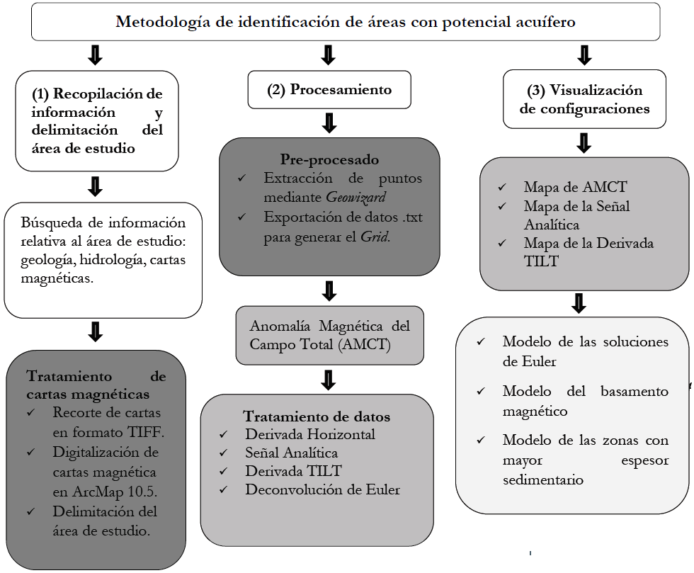Para cumplir con el objetivo propuesto para esta investigación, se llevaron a cabo varias etapas fundamentales (Figura 3). En primer lugar, se realizó una recopilación de información relacionada con la geología de la zona de estudio. Posteriormente, se obtuvo la información aeromagnética de las 9 cartas magnéticas a escala 1:50,000 en el Servicio Geológico Mexicano (SGM) en formato PDF (Pichucalco E15-C29, Reforma E15-C19, Raudales Malpaso E15-C48, Villahermosa E15-D11, Huimanguillo E15-C18, Rómulo Calzada E15-C38, Estación Chontalpa E15-C28, Ixhuatán E15-C39, Tecpatán E15-C49), a las cuales se les aplicaron tratamientos para mejorar la calidad de las imágenes para su posterior digitalización y la delimitación del área de estudio en el sistema de información geográfica ArcMap.