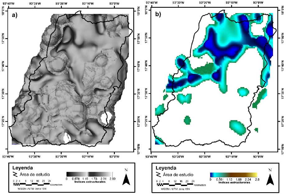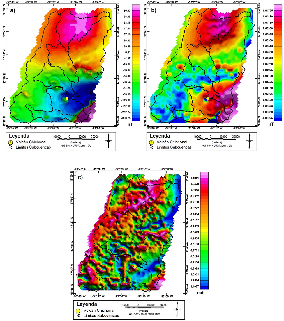En el mapa de la anomalía magnética de campo Total (AMCT) mostrado en la Figura 4a, se observa una anomalía con comportamiento dipolar de gran longitud de onda (dimensiones mayores) que se extiende sobre el área de estudio. La parte con valores de tendencia positiva se ubica al norte, y la parte de valores negativos al sur. La dirección principal de las anomalías presentes en esta configuración es NE-SW. Según la distribución de subcuencas hidrográficas en la zona, los bajos magnéticos están enmarcados en ciertas porciones de las subcuencas R. Zayula, R. Pichucalco, R. Tzimbac y R. Platanar, al sureste de la zona de estudio. Cabe señalar que esta zona está asociada al vulcanismo reciente producido por el volcán Chichonal, por lo que las respuestas magnéticas presentes se ven fuertemente afectadas, debido a que las anomalías termales en profundidad afectan la magnetización de las rocas y, por lo tanto, a las anomalías magnéticas observadas en superficie (Carrillo-de la Cruz et al., 2020).