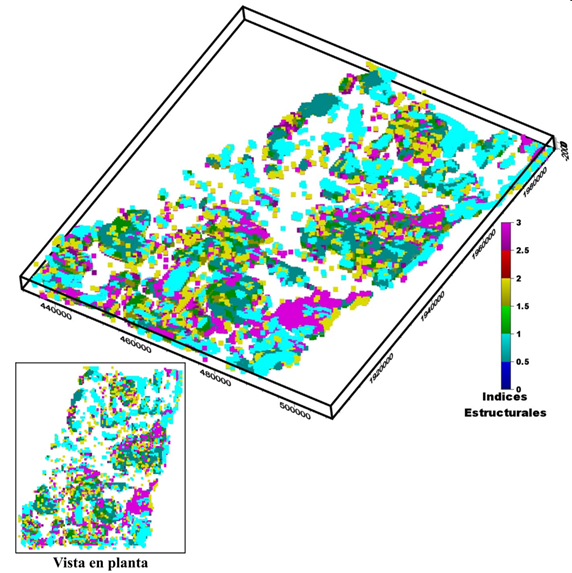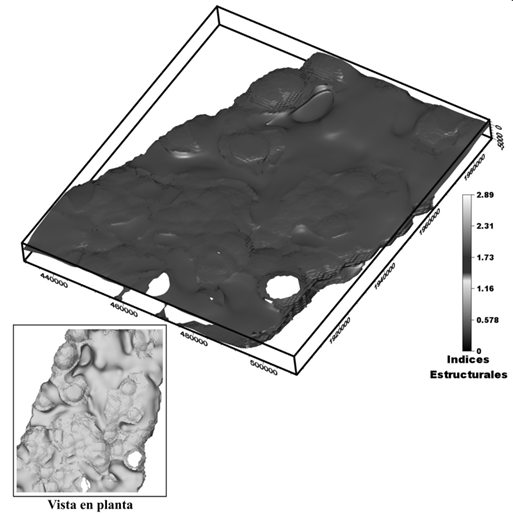 En relación con la construcción del modelo magnético en la zona estudiada, se aplicó la Deconvolución de Euler (DE) para los índices estructurales 0.5, 1.0, 1.5, 2.0, 2.5 y 3.0 utilizado una ventana de 9x9 datos, y así obtener los rasgos de profundidad asociados a cambios en la geometría de la distribución de los materiales magnéticos que constituyen la base para la construcción del modelo magnético (Figura 5). Todas las soluciones obtenidas con la DE fueron integradas a una misma base de datos. Posteriormente se interpolaron estos valores utilizando el método de vecinos cercanos en el software Voxler 4.1, esto con el objetivo de integrar la respuesta de una fuente magnética equivalente asociada a la capa de roca magnética, que constituye el basamento cristalino impermeable. El uso de un solo índice estructural solo proyecta una parte de la estructura, así que al interpolar las soluciones se genera una imagen que muestra la distribución de estas fuentes magnéticas (Figura 5).