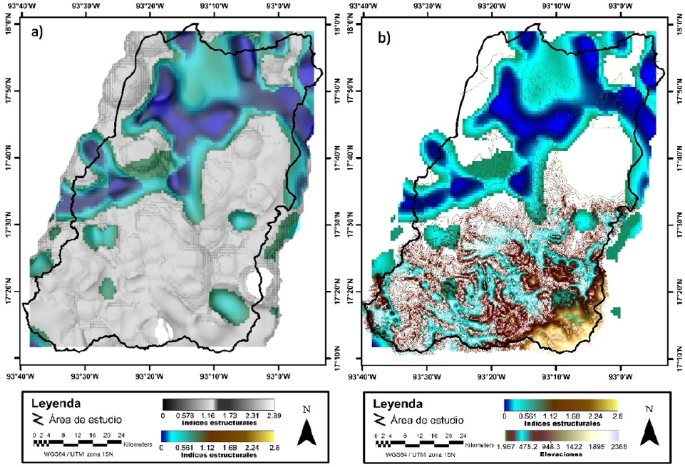 El área de estudio se caracteriza por valores de elevación de entre 1 y 2,425 m s. n. m., aunque gran parte de la zona puede considerarse de baja elevación (Figura 1d). En cuanto la geomorfología de la zona de estudio comprende una porción de la Planicie Costera del Golfo en su parte norte, encontrado relieves suaves con lomeríos en cadena orientados preferencialmente en dirección noreste-suroeste y elevaciones que alcanzan poco más de los 300 m s. n. m. La porción sur del área de estudio se caracteriza por una serie de sierras y valles. Esta zona está constituida por las denominadas Montañas del Norte, formando una franja con orientación este-oeste y altitudes que rebasan los 1,500 m s. n. m. (DOF, 20/04/2015). Dentro de esta porción, a unos 20 km al suroeste de Pichucalco, se encuentra el volcán Chichonal y sus rocas volcánicas asociadas (Figura 1e) (Plascencia et al., 2014).