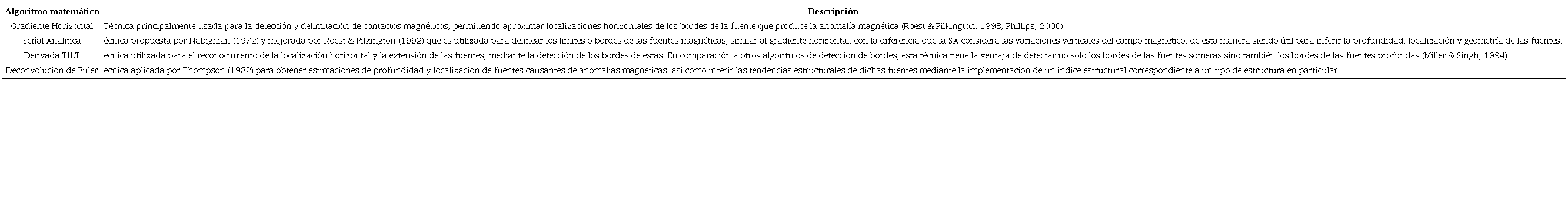 Una vez concluido el proceso de digitalización, se continuó con el preprocesado, el cual consistió en la agrupación de los datos correspondientes a las nueve cartas magnéticas. A continuación, se generó una matriz de datos inicial o grid (archivo GRD) que posteriormente se cargó al software Oasis Montaj, generando así el mapa de Anomalía Magnética de Campo Total (AMCT). Consecuentemente, se aplicaron diversos filtros o algoritmos matemáticos considerados en la metodología para el procesado de los datos, tal como se muestra en la Tabla 1. Derivado de ello, se obtuvieron los distintos mapas correspondientes a los filtros aplicados, los cuales fueron Anomalía Magnética del Campo Total (AMCT), Señal Analítica y Derivada TILT.