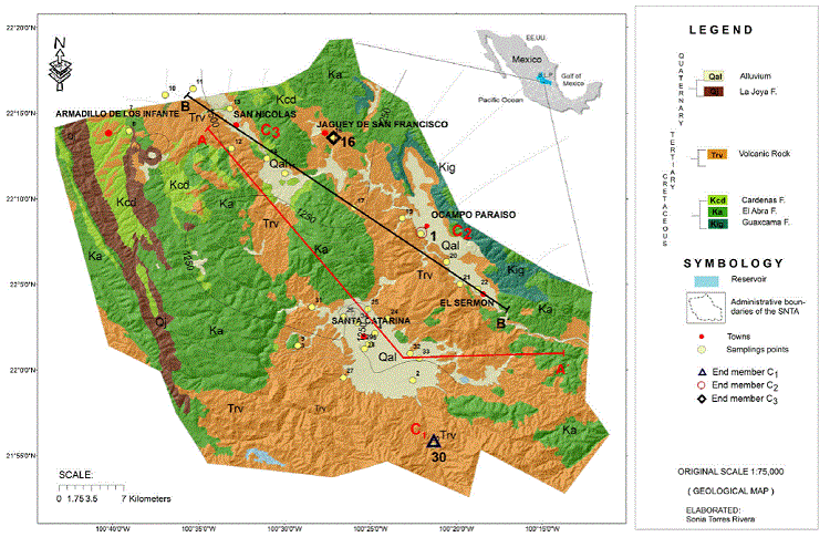 Key words: hydrogeochemistry, ternary mixture, end-member, conservative element, local flow, Sierra Madre Oriental.