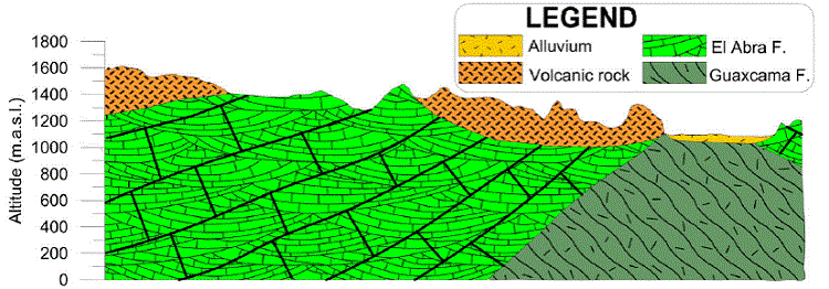 The Cretaceous rocks are covered discordantly by volcanic rock sequences of andesitic and rhyolitic composition (Casa Blanca andesite, Santa María Ignimbrite, Portezuelo Latite, San Martin Avalanche, San Nicolás Formation, and Jagüey Formation; Torres Hernández et al., 2010). This set of Paleogene (Oligocene) volcanic units is mainly distributed in the south-central part of the study area, with thicknesses greater than 140 m (Labarthe-Hernández et al., 1982). Alluvium sediments cover all the units locally. Figure 2 shows a longitudinal geological section of the Peotillos, San Nicolás Tolentino and Santa Catarina valleys, looking towards the east (Figure 2). It can be observed that the Sierra de San Nicolás Tolentino is a remnant that belongs to a flank of an anticlinal that was eroded in Ocampo Paraiso sub-basin.