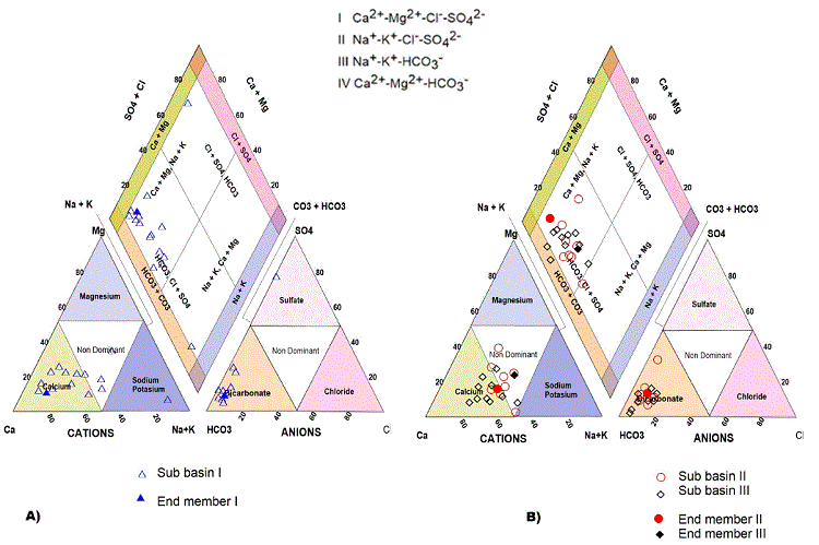 The statistics of the chemical results of the groundwater samples are presented in Table 1. The results show that sub-basin I has a lower temperature, is rich in K+, Ca2+, HCO3-, Cl-. Sub-basin II has an average temperature, lower ph, DO, Eh, Na+, K+, Ca2+ and higher Mg2+. The sub-basin III presents higher T, pH, EC, DO, Eh, Na+, SO42- and lower Alkalinity, hardness, Cl- .