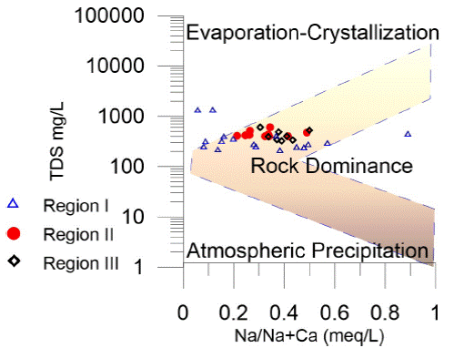 To identify some hydrogeochemical processes that occur in the groundwater, diagrams are used such as Gibbs diagrams (Gibbs, 1970), which was developed for surface water studies; however, in recent decades it has been used for the study of groundwater. The three main mechanisms that control the chemistry of surface water can be defined as the domain of atmospheric precipitation (rain), the domain of the rock, and domain of the evaporation-crystallization process (Gibbs, 1970). The Gibbs diagram was elaborated with the chemical data (anions and cations) of the groundwater samples (Figure 4).