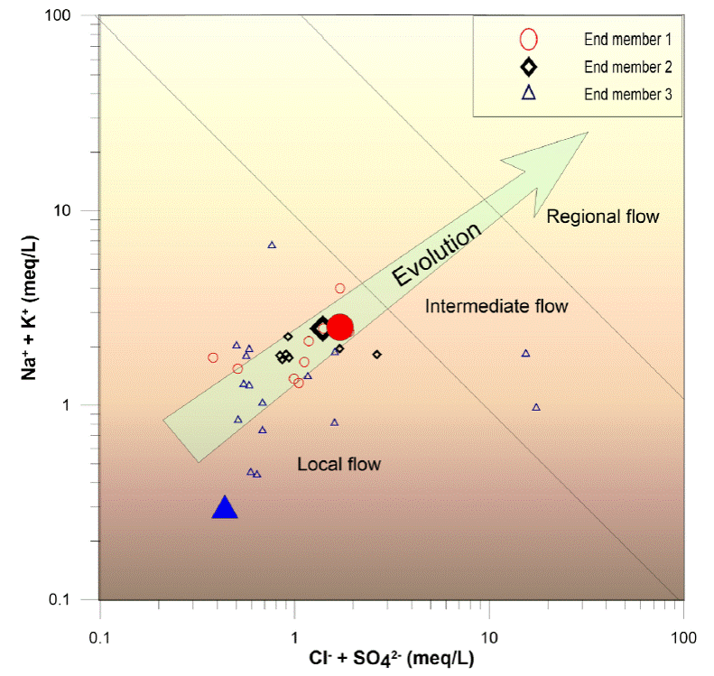 The increase of chemical components during the evolution of the groundwater can be observed in the Mifflin diagram (Mifflin, 1968) and uses hydrogeochemical indicators (Na+ + K+ + vs. Cl- + SO42-) to understand the evolution of groundwater and establish the different types of water flows (Figure 5). It is divided into three zones, and the area closest to the origin is due to the low circulation and short residence time of the water, the samples in this area are associated with the recharge (local flow). In the next zone, the concentrations increase and may be associated with a long-distance or longer residence time (intermediate flow).