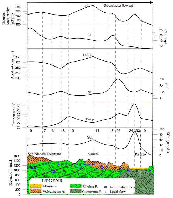 The physical parameters of sub-basins II and III, in the Armadillo de los Infante reveal that the electrical conductivity in the waters is approximately 650 µS/cm, along the hydrogeochemical section. The highest point is located at the center of the section in Paraiso, due to the interaction of the groundwater with the limestones whereas lowest point at the end of the section in Ocampo Paraiso town, because there is a mixture of local recharge water through the volcanic rocks. The concentration of chlorides is high at the beginning of the section, with values of 25 mg/L due to the agricultural activity that takes place in that area. Concentrations tend to decrease toward Ocampo Paraíso where it is possible for groundwater to mix with waters of recent infiltration. The alkalinity starts with values of 320 mg/L in Armadillo de los Infante and increases in the Ocampo zone due to the interaction of the water with the limestones, decreases to 240 mg/L at the end of the section due to mixing with water from recent infiltration (Figure 7).