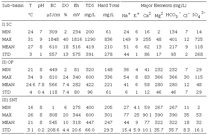 The waters family in the sub-basin II of Ocampo-Paraíso, is Ca-Na-HCO3, reflecting above all the interaction of the currents with calcareous rocks and the incorporation of the sodium liberated from the volcanic clasts in the granular medium.
