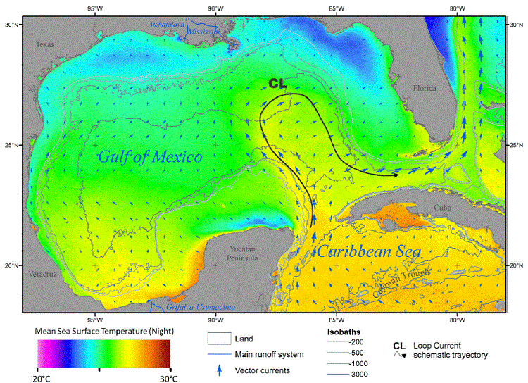 La delimitación oceánica del GoM ha sido un reto, debido a que sus características oceanográficas tienen un comportamiento altamente dinámico (Muller-Karger et al., 2015). El GoM es una cuenca semicerrada cuya dinámica oceanográfica tiene una fuerte influencia de las aguas que ingresan del Mar Caribe por el canal de Yucatán. A su vez, la salida de agua del interior hacia el Atlántico a través del canal de Florida, tienen influencia en las características oceanográficas de la costa oeste de Estados Unidos (Fiechter y Mooers, 2007).