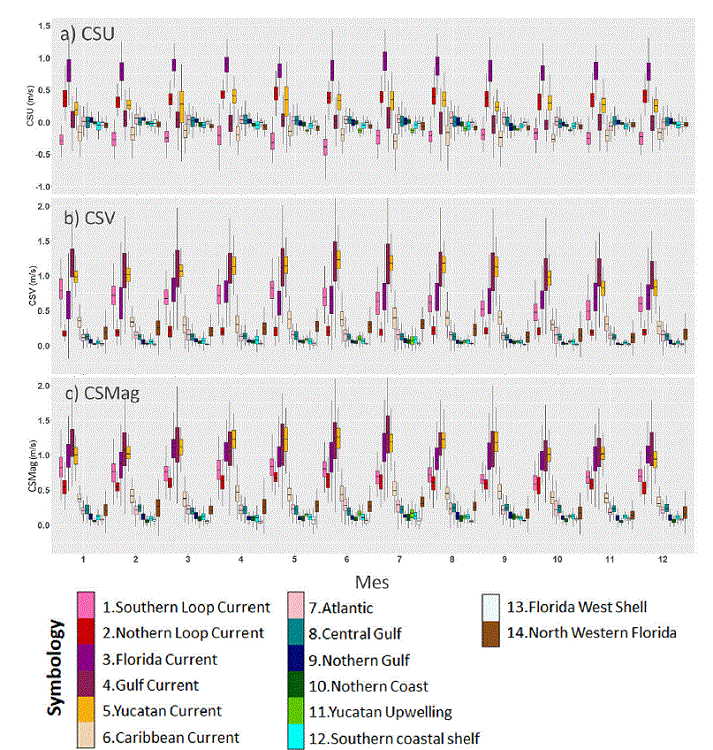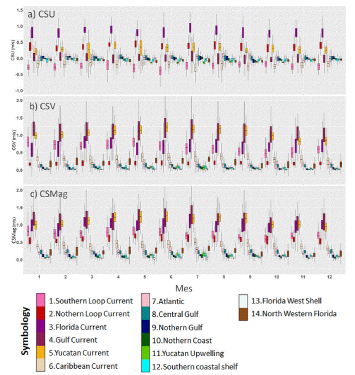 De forma general, la circulación superficial de la región presenta componentes en U y en V (CSU y CSV) positivos, a excepción de las unidades 6.Corriente Caribe y 7.Atlántico con un componente de circulación hacia el oeste (CSU negativo). Con circulación hacia el este, están la UO 3.Corriente de Florida, seguida de las UO 2.Corriente del Lazo Norte y 5.Corriente de Yucatán; aunque ésta última es la segunda más intensa en CSV y la segunda en la magnitud de la corriente (CSMag) (Figura 2).