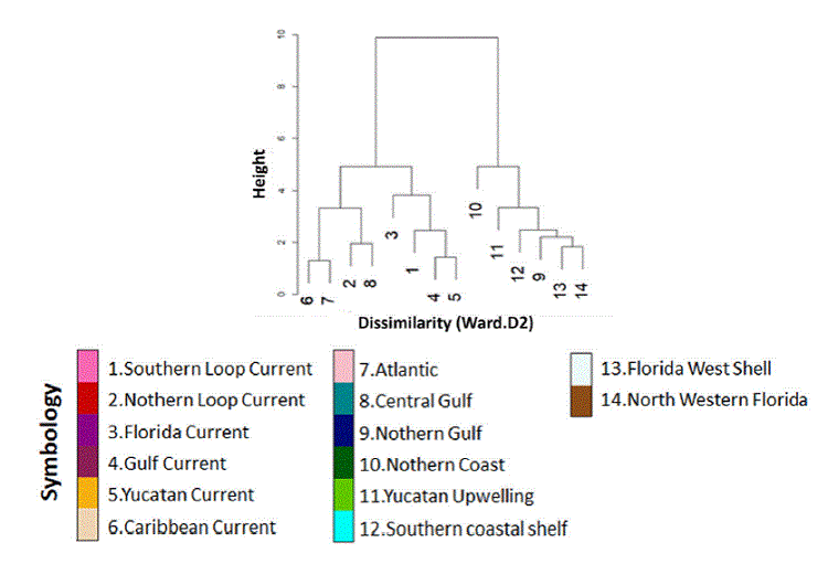 La unidad que llamamos Plataforma Oeste de Florida ha sido reconocida como una entidad diferenciable en varios trabajos, ya sea por su contenido biológico (Salmerón-García et al., 2010; Callejas-Jiménez, et al., 2012), por su relevancia ecológica (Yáñez-Arancibia y Day, 2004) o por la particularidad de la circulación (Miron, et al., 2017). Esta UO presenta una circulación muy débil que es una barrera de transporte, y que aísla los aportes de ríos y lagunas de Florida (Olascoaga, 2010) y, de forma similar que en Salmerón-García et al. (2010), tiene características similares con la del Plataforma Continental sur, especialmente durante el verano.