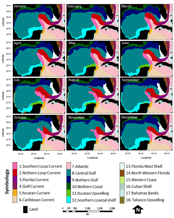 Abstract: The Gulf of Mexico (GoM) is a large marine ecosystem that has unique oceanographic dynamics, as it shows important spatio temporal variations in the configuration of its surface waters. Several studies have used the thermal and biological features to subdivide the GoM, while other had provided subdivisions using circulation features. Nevertheless, none of those works have produced a dynamic regionalization that consider biological and physical features of the GoM simultaneously. The goal of this work was to propose a dynamic division of the GoM which considers physical and biological features and to analyze the monthly spatial evolution of regions in an average year. We used statistical multivariate analysis to recognize the underlying structure of the data, to generate a monthly expression of clusters and to test the robustness of the achieved regionalization. We obtained 18 regions called oceanographic units (UO) that merged unique surface characteristics of the GoM and that had a monthly spatial configuration. We observed two main groups of UO: those that are mainly related with circulation properties and those that were defined by its biological and thermal associations. Fifteen UO were present all year long, while three of them were only present some months. All UO have monthly internal variations and their boundaries displayed seasonal spatial variation; however, they remained well differentiated from each other. This study offers a novel way to divide an oceanic system, which provides quantitative and pragmatic parameters that can help to develop monitoring systems considering the intrinsic ocean dynamics. The information about oceanographic unit variability provides valuable information to promote marine resources management, in concordance to their temporal association with certain water masses. These results also provide the basis to analyze interannual variations of oceanographic units to offer information about the sea surface dynamics and to help understanding a complex system such as Gulf of Mexico.