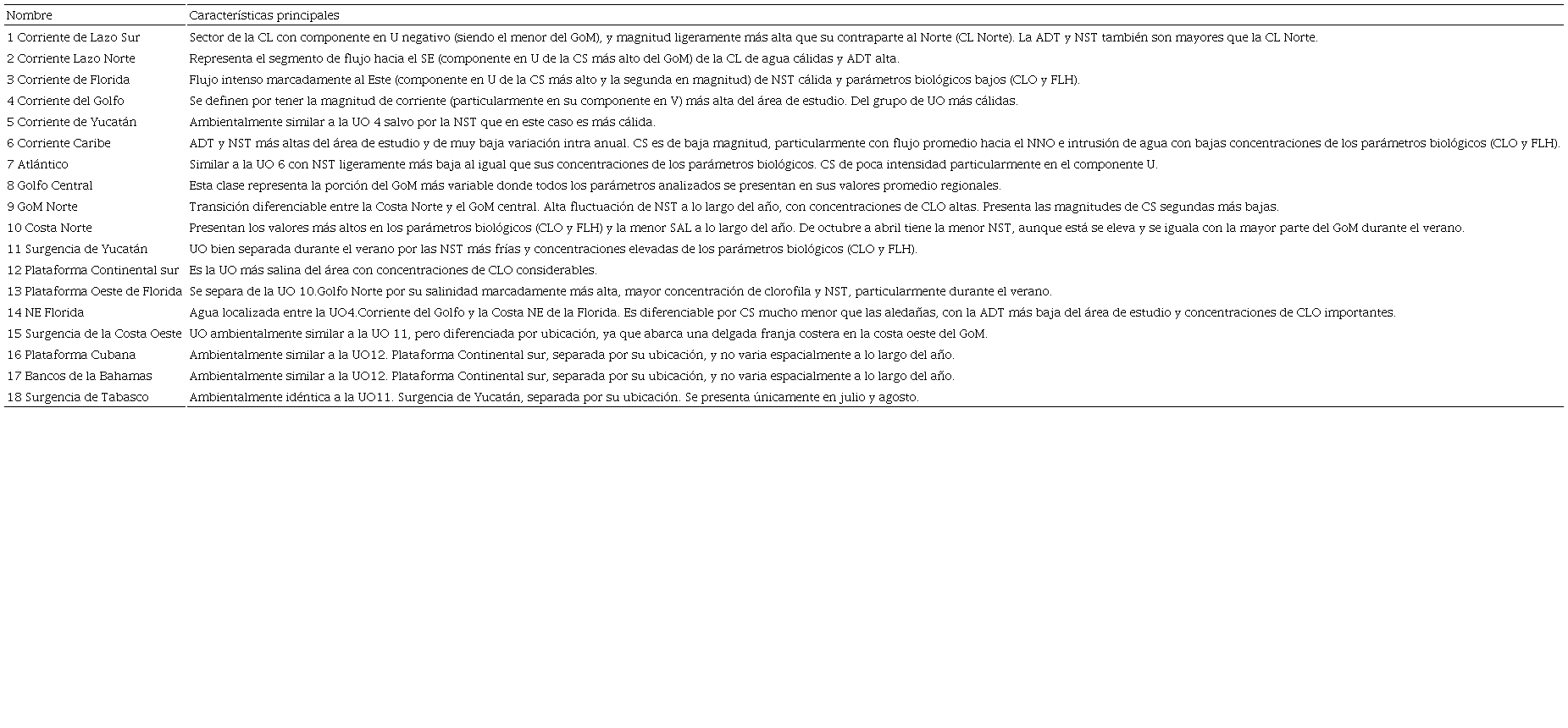 Se obtuvo un esquema de definiciones ambientales de 14 unidades oceanográficas (UO) diferenciables por sus características biofísicas más cuatro UO separadas espacialmente (tabla 1) y con una secuencia consistente a lo largo del año de los parámetros que las definen por sus valores promedio y desviación estándar (Figuras 1-3). Mensualmente se observan entre 15 y 18 UO, ya que las UO 11.Surgencia de Yucatán, 15.Costa oeste y 18.Surgencia de Tabasco, se presentan estacionalmente entre mayo y agosto. El resto de las UO tienen representación a lo largo del año, con variaciones tanto en los parámetros biofísicos (Figuras 2-4) como en su extensión (Figuras 7).