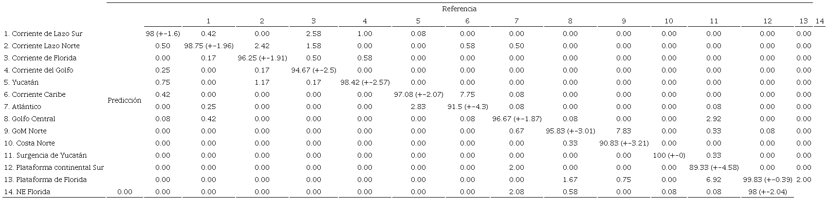 Se generó una matriz de confusión general que promedia las matrices de confusión mensuales, donde se excluyen las UO 15 a 18 que son separadas por ubicación y no por sus valores ambientales (Tabla 2). La exactitud promedio por UO es superior al 89% (D. E.= 7.83%). Las confusiones principales ocurren entre la 9.GoM Norte y la 10.Costa Norte, particularmente entre mayo y octubre debido a la homologación de la NST y a incrementos en las CLO y FLH; entre las UO 6.Corriente Caribe y la 7.Atlántico y entre 12. Plataforma Continental sur y 13.Plataforma de Florida, por ser consistentemente unidades similares en todos los meses. Existen confusiones menores entre las UO1 y UO4, entre las UO2 con UO3 particularmente por la similitud que presentan en los parámetros de la circulación superficial.