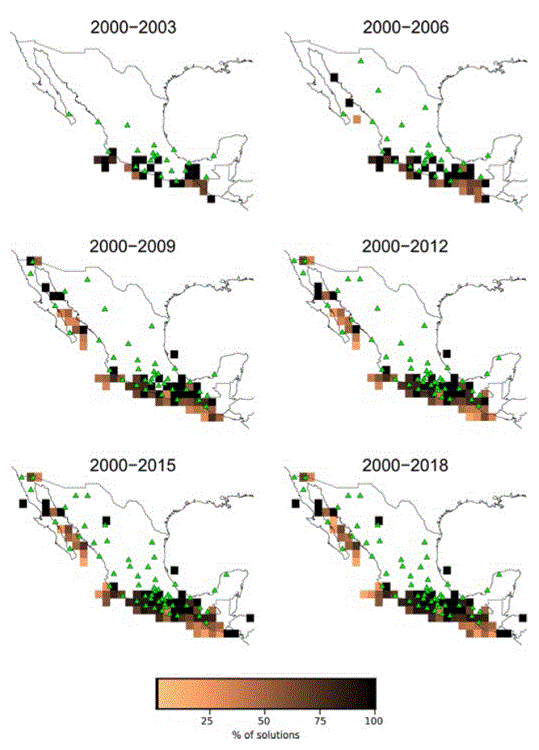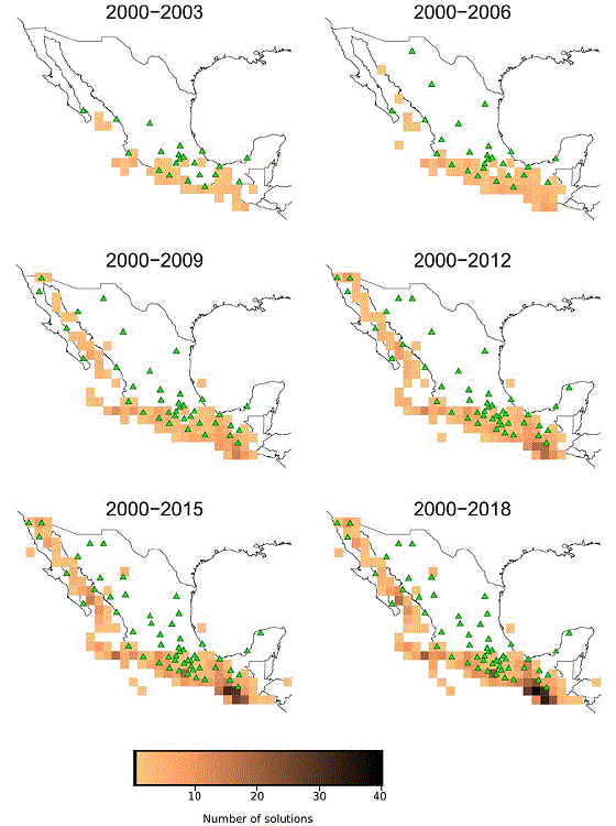 To analyze a possible temporal evolution of the quality of solutions, in Figure 8 we show 1x1° regions with colors indicating percentage of solutions found in each square with VR ≥ 50%. We also include the location of stations (green triangles) operating at the end of each epoch. It is important to mention that solutions are cumulative. This figure shows that, at the beginning of the catalog (2000-2003), only some specific regions of the Pacific coast and the Tehuantepec Isthmus had reliable solutions. The map corresponding to 2000-2009 shows a remarkable change with respect to the previous one, especially in reliable solutions obtained for the Gulf of California and Central Mexico. The last frame shows the situation of the entire catalog (2000-2018) where we obtained reliable solutions for South and Central Mexico and the Gulf of California. In the supplementary material (appendixFigure S-1) we include a similar figure, but colors representing the quantity of solutions instead of quality for the RMMT catalog.
