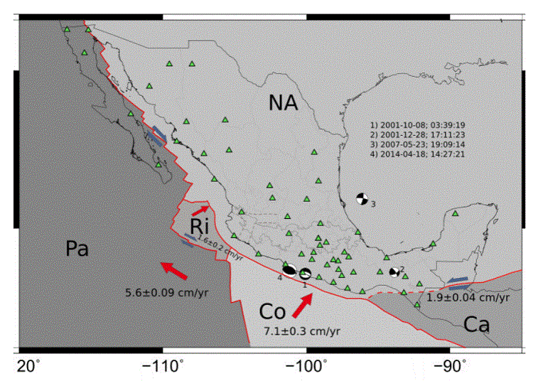Mexico is located in a tectonically active setting. Most of the recorded seismicity is due to the interaction between five major tectonic plates (Figure 1), namely: North American, Pacific, Cocos, Rivera and Caribbean. This tectonic context represents a challenge for improving strategies to monitor seismic activity and to get more information about the recorded events.