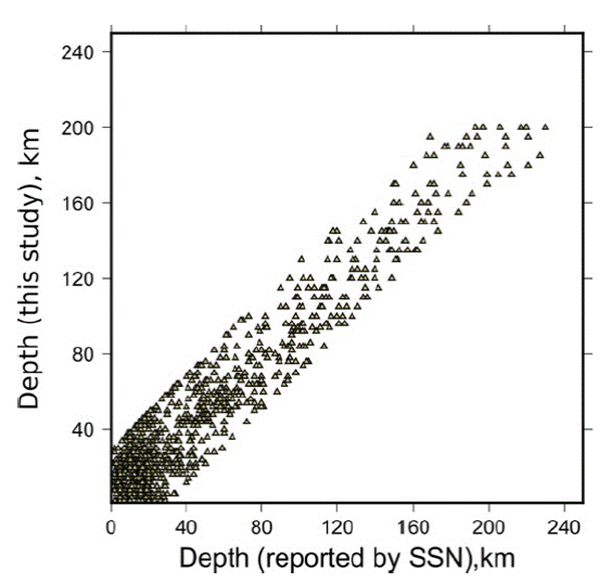 Since hypocentral depth has larger uncertainty compared to epicentral location, the moment tensor inversion procedure includes a grid search around the reported depth by SSN (section 2.3). The best solution, after grid search, do not show a specific relation with input depth, except for the constraints imposed by the ± 30 km interval in the grid search (Figure 9). Although uncertainty in depth reported by SSN may be large, it is not possible to conclude whether the depth obtained by the procedure is better determined.
