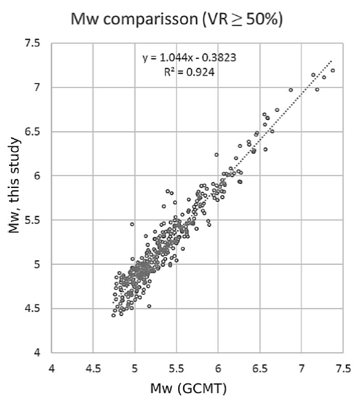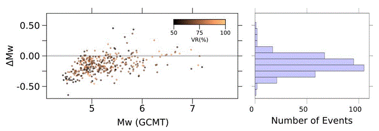 The linear least squares fit between the datasets has a high correlation coefficient R2 of 0.92 (Figure 10). Although the R2 is good, the slope (1.044) and intercept (-0.38) of the equation suggests that there is a systematic underestimation of magnitude with respect to that reported by GCMT (Figure 11). We note that the disparity increases for magnitudes Mw ≤ 6.5. These differences have also been observed for smaller regional catalogs (e.g. Gasperini, et al., 2012, Pondrelli et al., 2016). There is not enough evidence to discriminate if the magnitudes of GCMT are overestimated or our determination of Mw is underestimated. A further analysis of Mw with independent data and/or other method could help solve this issue.