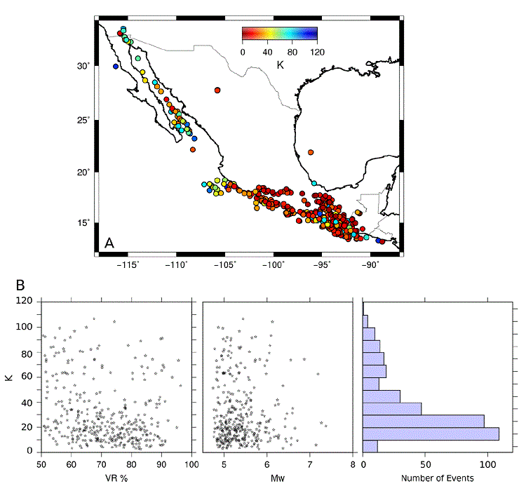 Figure 12 A shows the geographical distribution of K value. Plots in Figures 12 B and 12C (VR vs. K and Mw vs. K) show that there is no evident correlation between K and VR, or K and Mw.