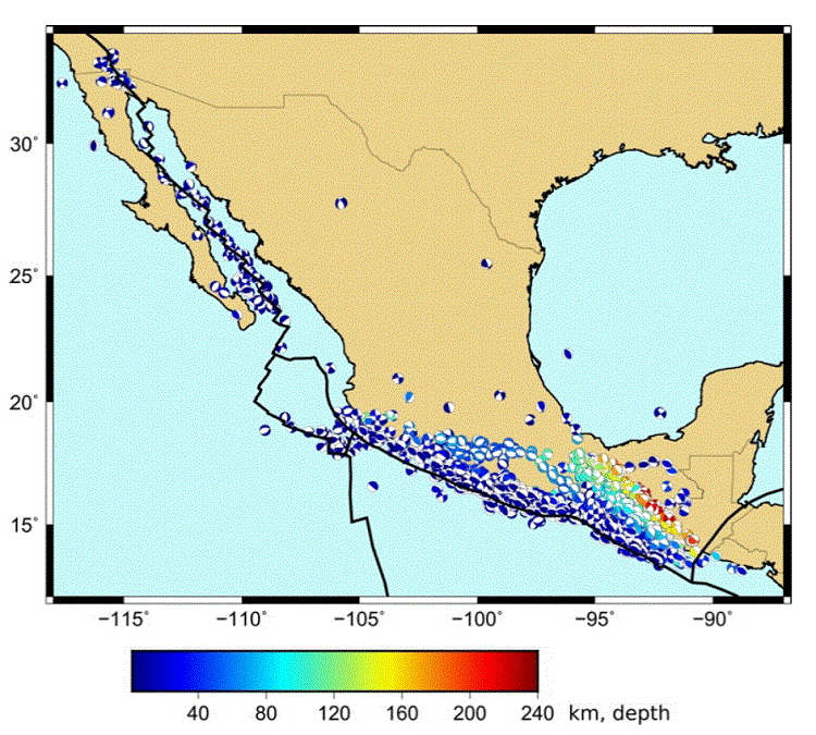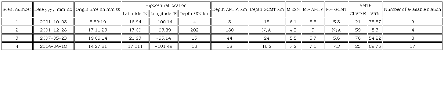 Seismic Moment Tensor Solutions (MTS) for earthquakes worldwide, including Mexico, are systematically computed by the Global Centroid Moment Tensor Project (GCMT) (Dziewonski and Woodhouse, 1983; Ekström et al., 2012; http://www.globalcmt.org/), and by the National Earthquake Information Center (NEIC) (http://neic.usgs.gov). In both cases, body and surface waves, recorded at teleseismic distances, are inverted to obtain the MTS.
