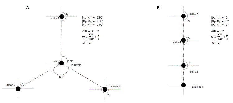 Finally, to choose the selected combination, we weight VR with a function which depends on azimuthal coverage of the combination. For a three station scenario, the ideal azimuthal coverage (minimum gap) has stations 120° from each other; this implies that the absolute value of the azimuth differences between each station (cover area) is 160° in average . Therefore, the worst scenario is with three aligned stations, = 0° (see Figure 5).