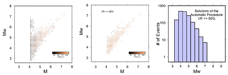 Figure 7 shows a plot of the output magnitude (Mw) versus input magnitude (M) as reported by SSN. VR of the events are represented by the color of the symbol. This figure reveals a large disparity for some input magnitudes and the Mw obtained, especially for lower magnitudes. This disparity decreases if we consider a subset of events with VR ≥ 50% (Figure 7, middle). However, for higher VR (e.g. VR ≥ 70%) the correlation does not improve significantly. So, VR ≥ 50% provides a quality control to accept (or reject) MTS. Although the number of solutions decreases considerably, such VR criterion gives reliability to the final catalog. Figure 7 (right) shows the magnitude distribution for MTS for VR ≥ 50%.