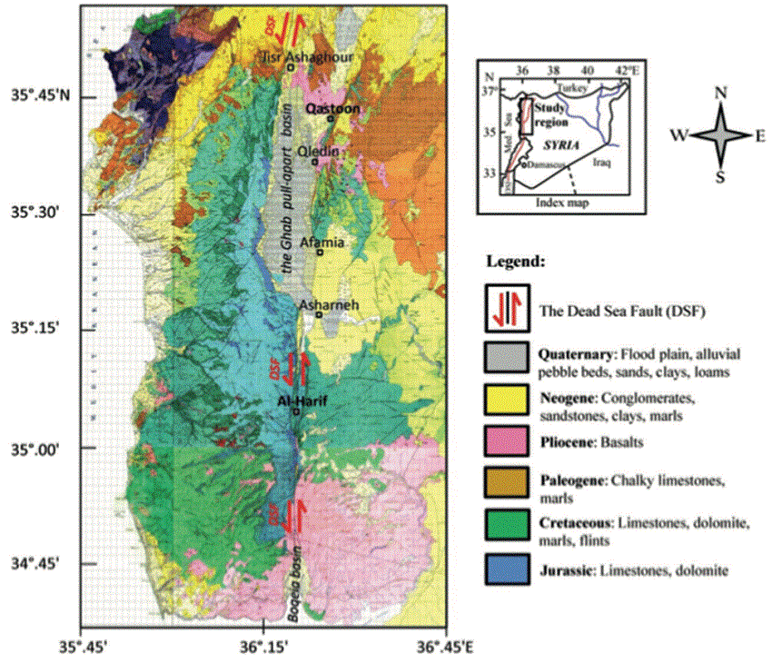 Devyatkin, E. V., Dodonov, A. E., Sharkov, E. V., Zykin, V. S., Simakova, A. N., Khatib, K. and H. Nseir, H., 1997. The El-Ghab Rift Depression in Syria: Its Structure, Stratigraphy, and History of Development. Stratigraphy and Geological Correlation, Vol. 5, No. 4, 1997, pp. 362-374.