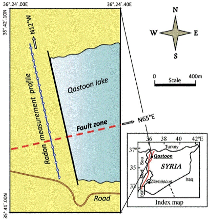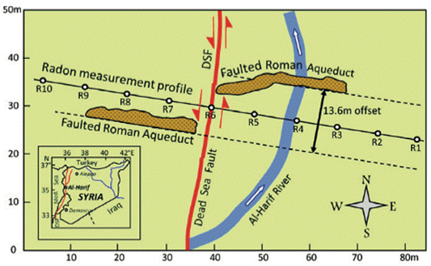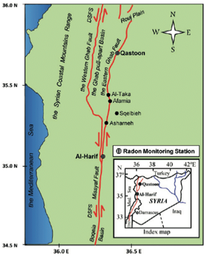 Radon is commonly transported within the earth’s crust by two basic mechanisms, diffusion and/or convection of the gas flow (Tanner, 1964; Etiope and Martinelli, 2002). However, there are some important factors which could facilitate the migration process of radon and enhance the distance reached in the ground. Among these factors is the groundwater flow which plays a major role as driver of radon transport through permeable geologic medium, and could be brought upwards to the surface by a rising flux of some other natural gases, (e.g. CO2 and He) which act as radon carriers via fractures and rupture zones. Accordingly, the primary goal of this work is to investigate the effects of tectonic activity on soil radon emanations across two active fault structures - the Qastoon and Al-Harif segments that are located along the NDSF in northwestern Syria.