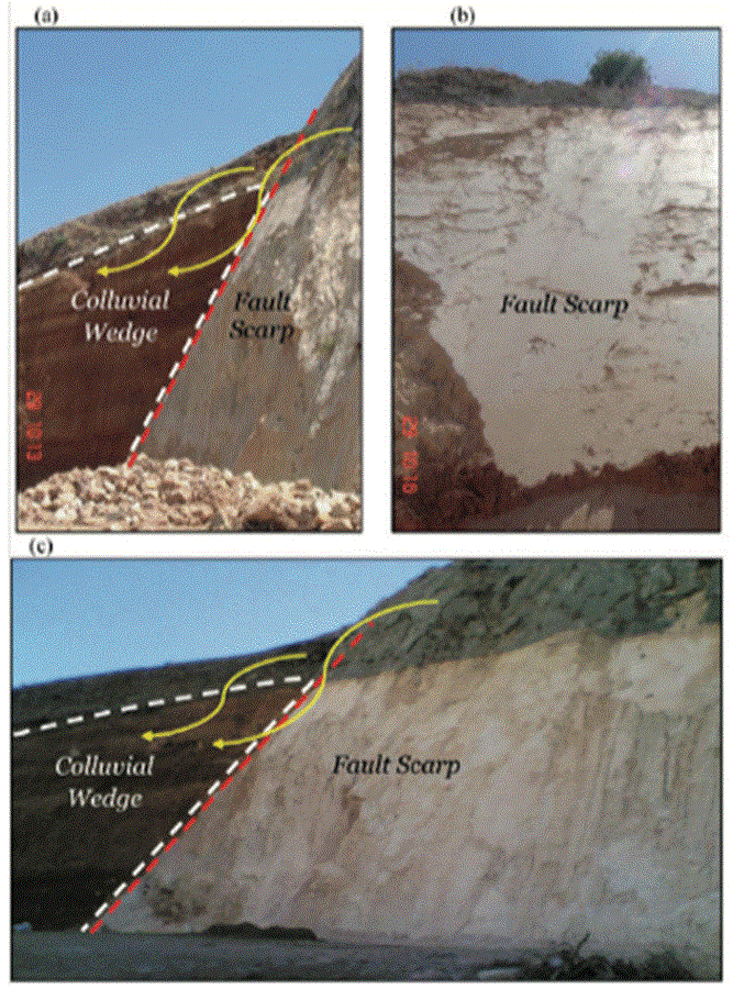 Tectonically, the left-lateral NDSF forms a key tectonic feature in western Syria that stretches over a distance of about 150 km in parallel to the Syrian Coastal Mountains Range (Brew et al., 2001). Along this distance, two major fault structures were considered important for the purpose of this study; the Qastoon and the Al Harif segments (Fig. 2). Field investigations in the study region revealed some significant geomorphic and topographic expressions which attest to the ongoing tectonic activities of the concerned fault zone. Evidences include the occurrence of recent lava flows; break in slope features; faulted young alluvial fans and the common occurrence of distinct deflected streams which indicates the role of tectonic activity in influencing the outline of drainage system (Meghraui, 2015). Besides, the formations of distinguished colluvial wedges which are commonly associated with recurrent ruptures of fault where each fault rupture creates a scarp with a sharp free face. Then, sediments that eroded from the free face is shed across the fault and filling up on the footwall of the fault due to slope failure as a result of erosion and re-deposition during successive dip slip of faulting, producing a colluvial wedge (Fig. 3). In our case, the observed colluvial wedges along the eastern Ghab fault were developed mostly due to tectonically induced gravity landslide of Pliocene-Quaternary unconsolidated sediments that are eroded from the free face of the fault scarp and accumulated at the footwall of the fault plane, producing a typical colluvial wedge, as shown in Fig. 3a, b and c. Accordingly, the interpretation of colluvial wedge stratigraphy and development may assist paleoseismologists to decode an ‘event-stratigraphy’ of past earthquakes (McCalpin, 2009).