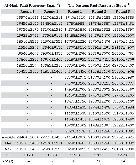 As mentioned previously, the estimated rates of radon coefficient variability (CV) in the Qastoon and Al-Harif sites revealed values of 58% and 66%, respectively. Thus, it can be deduced that the common dispersal pattern of radon variations in both sites seems to be fairly high, and this may reflect low homogeneity model. Such disparity might be referred to the differences in the concentrations between zones with higher radon signals that are usually associated with the fault structures, and area with normal radon emission that are naturally emanated from the surrounding unaltered rocks. Additionally, so as to justify that the anomalously high radon values are mainly related to tectonic activities and not only derived from the decay of radium in soil, chemical analysis for 226Ra content in soil was accomplished in some samples collected from the same locations where the radon concentrations were measured. The results of the analysis revealed very low concentration of radium values ranging from 1.06±0.08 to 1.14±0.20 mg.kg-1, with some results below the detection level (DL= 1 mg.kg-1).