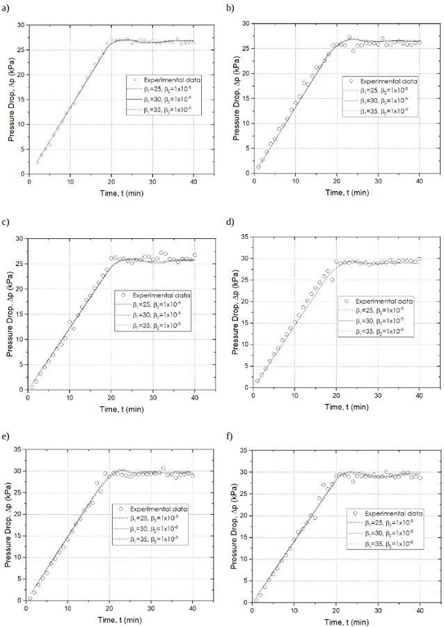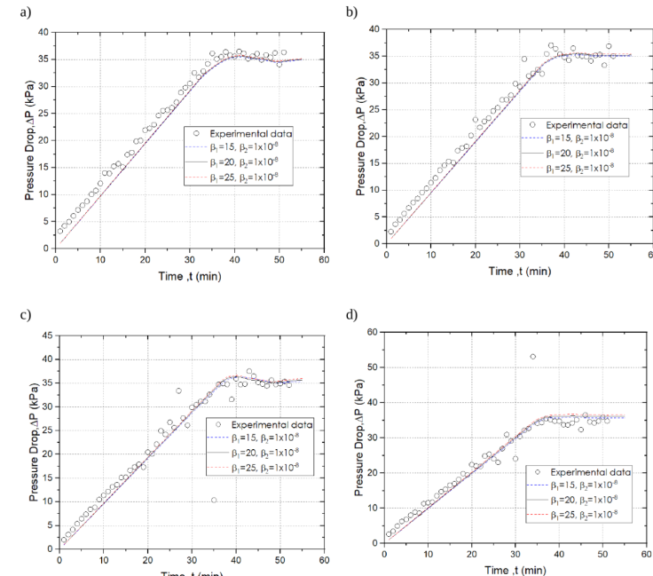 The model used to analyze the pressure drop experimental data involves fitting parameters permeability-stress correlation model (Eq. 13). The data fitting achieved has been excellent. This indicates that the mathematical model developed describes adequately the phenomenon.