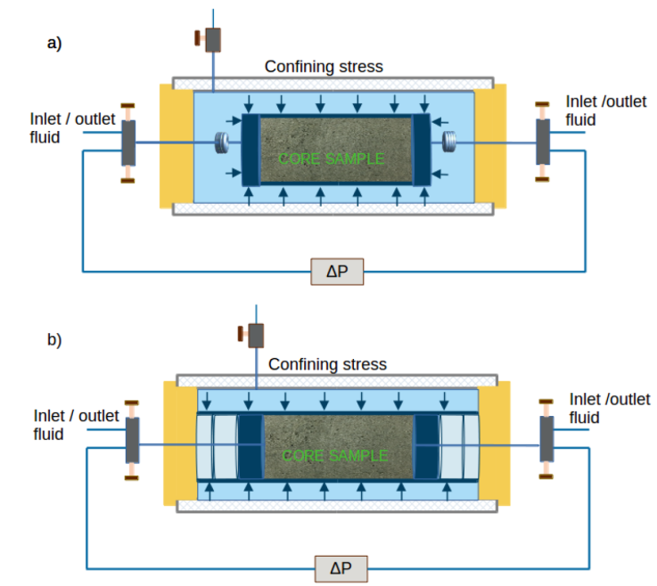 Traditionally, Hoek and Hassler coreholders are used in laboratory to measure dynamical properties as function of the rock mechanical properties. Instrumented Hoek triaxial coreholders can handle independently axial and confining (radial) stress and allow strain measurements in both radial and axial directions (Hoek and Franklin, 1968). In contrast, Hassler coreholders used in SCAL testing (McPhee et al., 2015) (Figure 2) can work in two possible test configurations: hydrostatic and non-hydrostatic. In the first case the radial confining stress equals the stress on the sample endfaces. On the other hand, in the second case, the radial confining stress differs from the endface stress. Sample A was employed in the non-hydrostatic tests, and sample B in the hydrostatic ones. Here, for evaluating stress effects on samples permeability a Hassler coreholder was used. The core is loaded in a Viton rubber sleeve and its endfaces are set in contact with the stainless steel difusser at each end. These are attached to the inlet and outlet fluid lines.