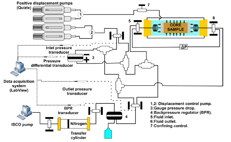 The fluid displacement system is composed by a Quizix pump Q5000, a back pressure regulator (BPR) controlled by a Teledyne Isco 260D syringe pump, pressure and temperature sensors and a National Instruments data acquisition unit. The pressure sensors measure the pressure at the sample endfaces, and the differential pressure transducer measures the pressure drop across the sample. The temperature sensor was set at coreholder body. The data adquisition system was programmed in LabVIEW 2018. A schematic view of the displacement system is shown in Figure 3.