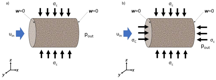 In this section, the numerical simulations of two case studies corresponding to non-hydrostatic and hydrostatic compression tests are presented. In both cases, the effect of the stresses on the petrophysical properties (permeability and porosity) is studied. To this purpose the previous poroelastic model is applied together with constitutive relationships for porosity and permeability in term of stress.