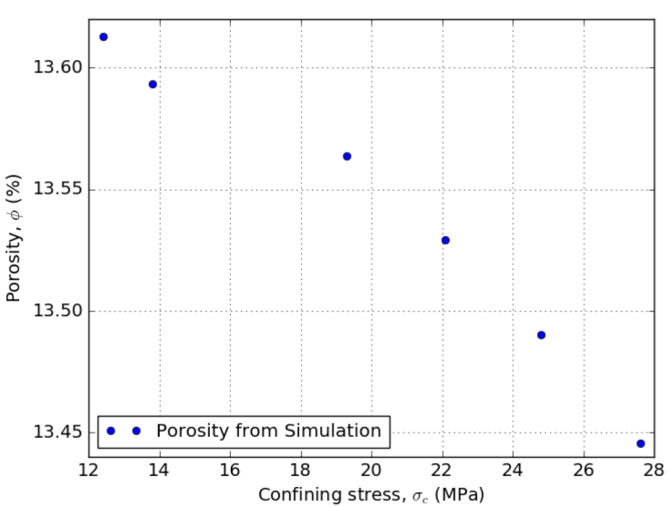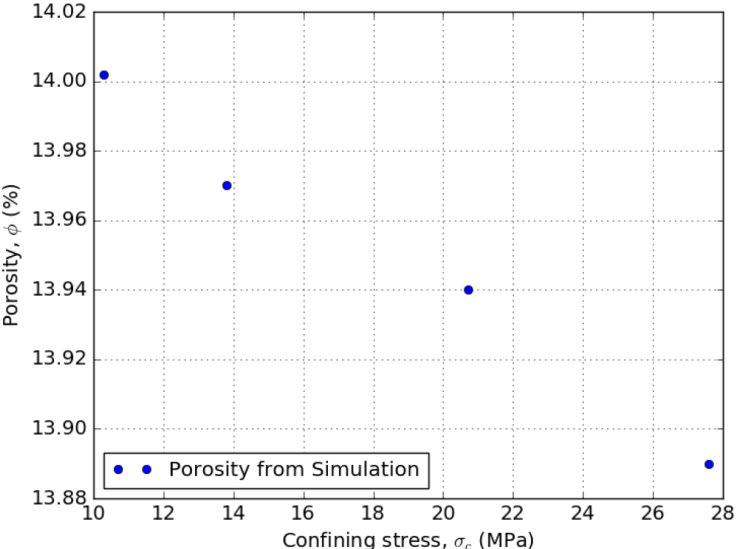 In the same way as in the non-hydrostatic compression tests Eq. 12 was used to estimate the dependence of rock porosity as a function of stress. The final results obtained for the non-hydrostatic compression tests are displayed in Figure 7. The porosity change shows the physically behavior expected for a core subject to an increasing confinement stress. A reduction of approximately 1% of the porosity in the core is estimated.