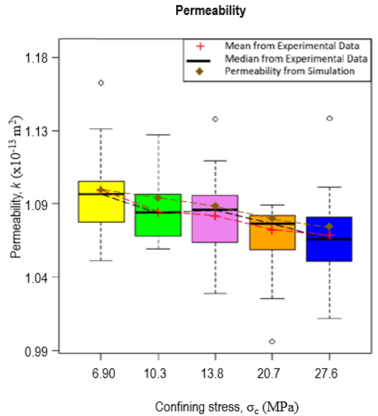 The porosity and permeability simulation results for the non-hydrostatic compression tests are displayed in Figures 5 and 6, respectively. The porosity change (Figure 5) corresponds to the physically expected behavior when subjecting a core to increasing confining stress. A reduction of approximately 1% of the porosity in the core is shown. It is important to notice that no measurements of porosity were made, it is only evaluated through Eq. (12). It could be observed in Figure 6 that the general trend shows the expected behavior of a core subjected to a increased confining stress except for the value at confining stress 19.3 MPa. It is also seen in Figure 6 that all numerical results (brown diamonds) fall within the boxplot of each test except in the aforementioned point. A core permeability reduction of approximately 8% at the end of the non-hydrostatic compression tests is observed. The simulated permeability values versus the experimental data give an acceptable RMS fitting error of 0.125.