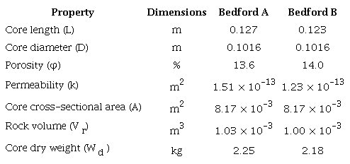 The permeability study was performed in two cylindrical samples (A and B) which were cored from a Bedford limestone block. The dimensions and physical properties of the cores are shown in Table 1. The displacement fluid used in the test was distilled water in order to prevent pore obstruction due to scale formation and deposition, and also to avoid calcite dissolution.