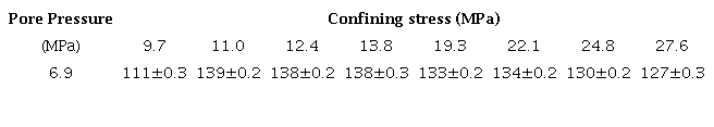 The effect of stress on permeability is clearly stronger when higher shear stresses are present (non-hydrostatic tests), than when small shear stresses are applied (hydrostatic tests). In the linear confining stress range analyzed, from 10 to 28 MPa, the non-hydrostatic case gives a reduction of 8% (with a pore pressure of 6.9 MPa) and in the hydrostatic case gives place to only 2% (with a pore pressure of 2.1 MPa). The above behavior could be explained by noticing that shear stresses can lead to large pore spaces reductions, probably due to a better rearrangement and closure of the internal porous structure of the Bedford limestone, which is made up of highly irregular grains.